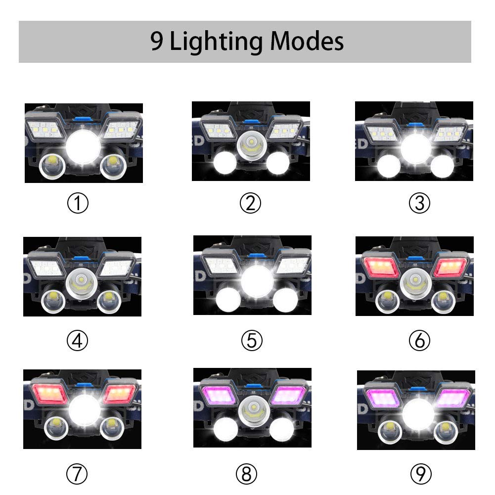 - This headiamp has two patterns and 9 brightness modes, press the power switch, the light will into pattern one it include 5 modes : Main L2 led brightness, side lights, L2 and side lights brightness, white beam for energry saaving, All lights brightness. Long press the switch into patterm two, t include 4 brightness modes, red and blue waming lights, L2 and waming lights, side lights and warning lights, L2 Sos