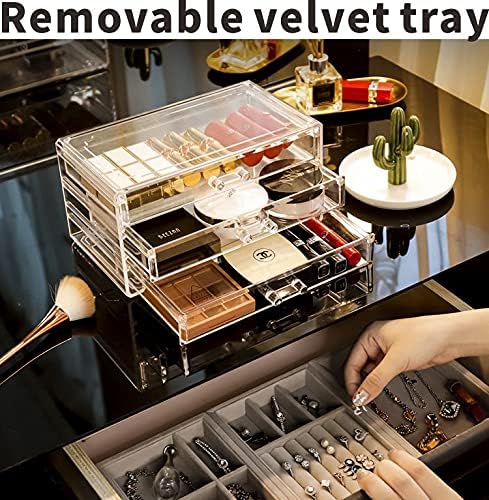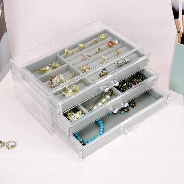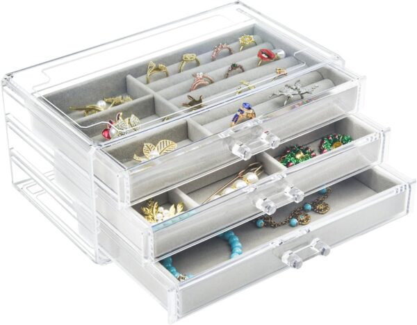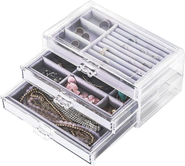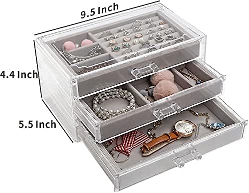 Title : Jewelry Organizer with 3 Drawers, Clear Acrylic Jewelry Box for Earring Rings Necklaces and Bracelets, Earing Organizer with Velvet Display Case, Gifts for Christmas Stocking Stuffers for Women