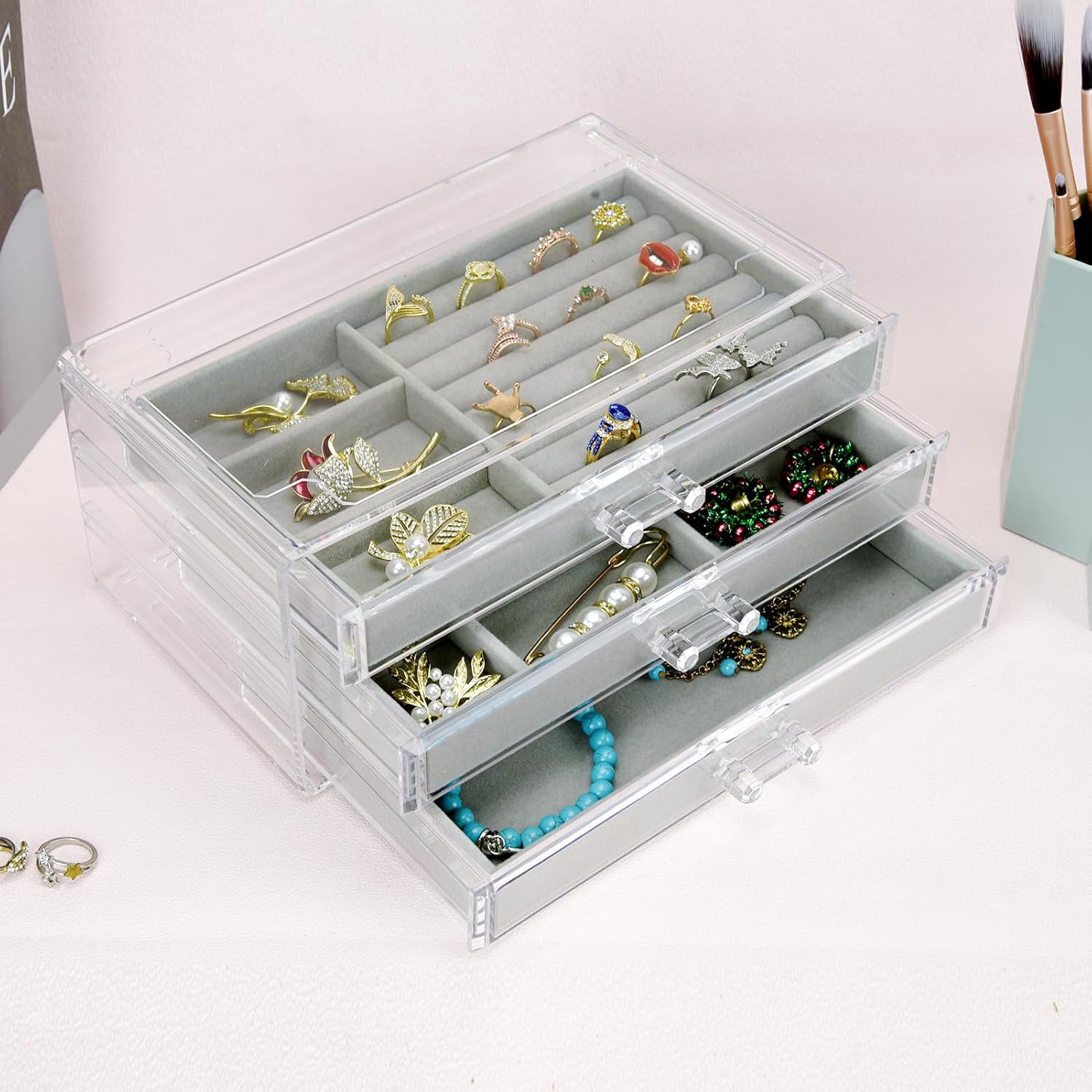 - Crystal handles: The drawers slide out smoothly, and the molded handles are very easy to grab and pull out. It allows you to access your rings, earrings, necklaces effortlessly.