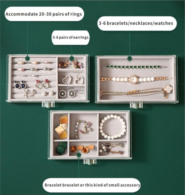 - Clear shell: The transparent outward keeps your favorite jewelry dust-free and makes you see what is inside on the top and pick out the one you want quickly. It’s easy to clear the box with the damp cloth.