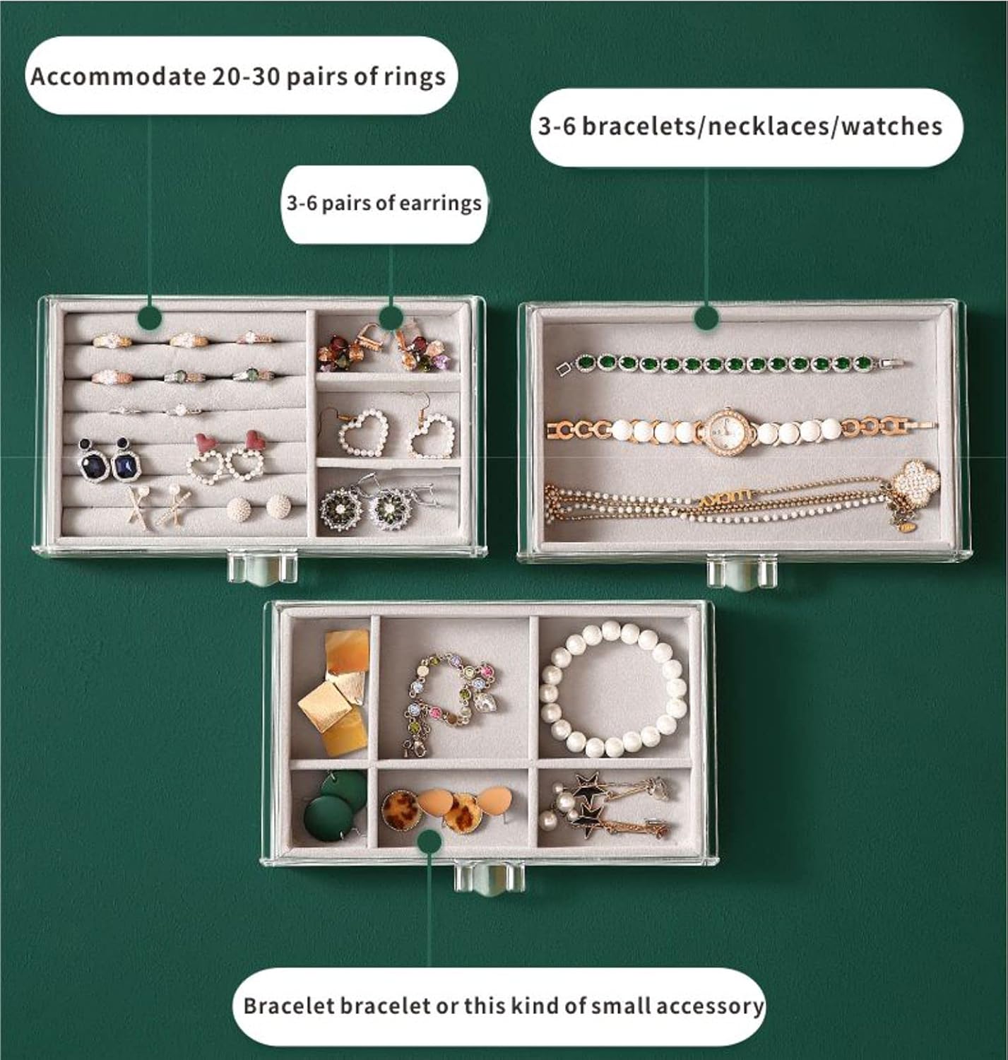 - Jewelry box with 3 drawers: Drawer compartments of various sizes for storing different jewelries. You can rearrange the drawers and trays according to your need.
