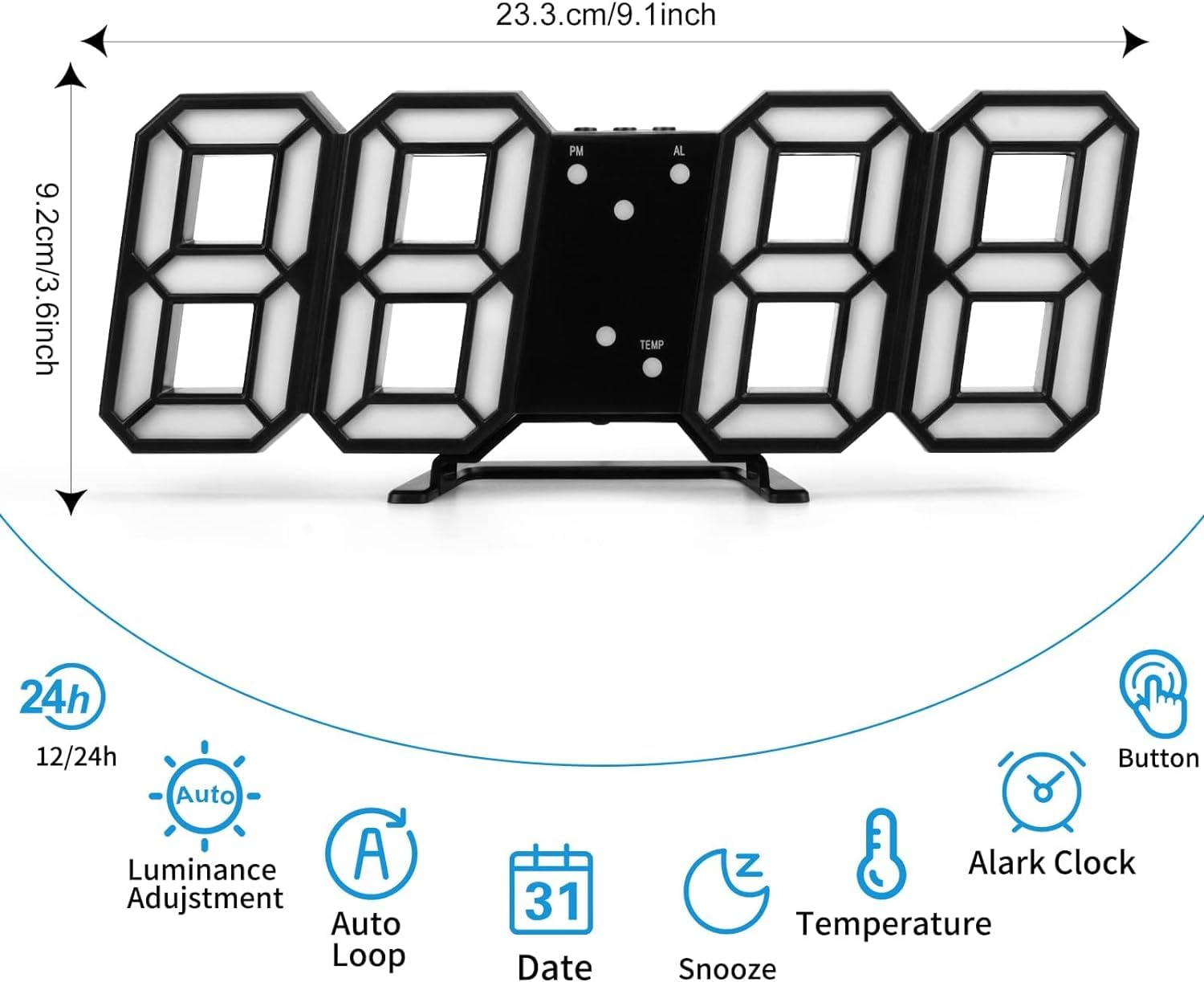 - Easy to Use: There are 3 buttons in the top of the digital clock, you can adjust the hour mode, brightness ,snooze function. It’s suitable for kids or adults.