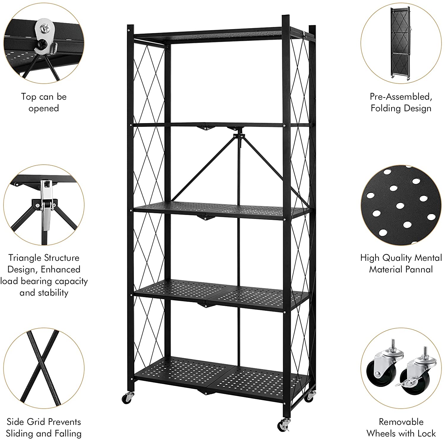 TITLE : Foldable Shelving Unit Storage Rack on Wheels Large Capacity, Heavy Duty Steel 5-Shelf Organizer with Hooks, Black 5 Layer Foldable Kitchen Rack, Foldable Kitchen Rack, Kitchen rack, Five Layer Kitchen Rack, Foldable Steel Rack with wheels