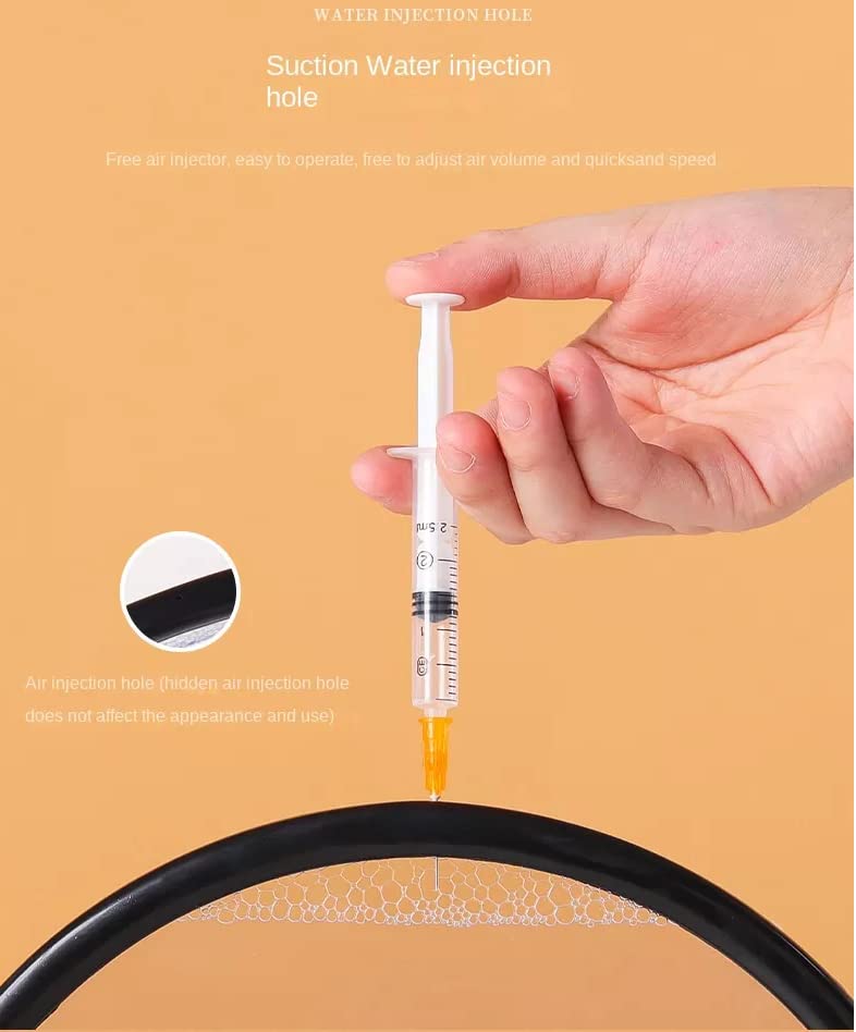 There are strict initial standards for the amount of air in sand paintings. Water will evaporate, because there is no absolutely airtight environment for this handmade product. Over time, the air inside may increase. In the hot summer, water will evaporate faster. At this time, the amount of air may need to be adjusted. This is easy to handle. You need a syringe with a thin needle and some clean water. A disposable syringe is sufficient. There is a small hole on the side of the rubber ring. Find the small hole and let the air come up and the sand sink. Insert the syringe into the rubber to adjust the water and air. The number of bubbles will directly affect the speed of the quicksand. The more air, the slower the flow rate. And the less air, the faster the flow rate. The most important thing is that the amount of water injected is the same as the amount of air extracted. In addition, please do not do this too many times, as this may damage the air tightness of the rubber.