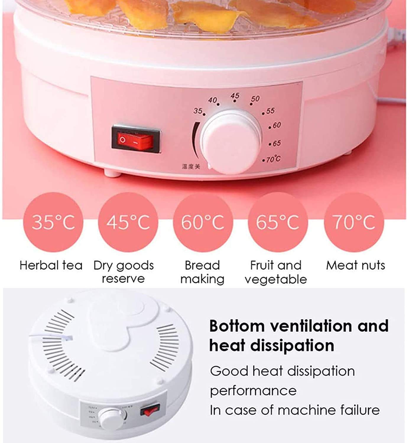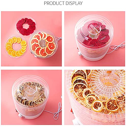 Food drying is a way to preserve fruit, vegetables, and animal proteins after harvest, that has been practiced since antiquity. Our food dehydrator removes moisture from food to aid in its preservation and uses a heat source and air flow to reduce the water content of foods. The water content of food is usually very high, typically 80% to 95% for various fruits and vegetables and 50% to 75% for various meats. Removing moisture from food restrains various bacteria from growing and spoiling food. Further, removing moisture from food dramatically reduces the weight of the food. Thus, our food dehydrator is a great solution to preserve and extend the shelf life of various foods.Dehydrate your food for enhanced preservation. Remove the moisture content from your food to make healthy snacks while retaining 97 percent of vitamins and minerals.This food dehydrator is the new way to dry various fresh fruit, vegetable, meat, etc, which is more healthier and easier than the traditional air dry. 5 trays allow a large capacity at one time. The machine is made of high quality plastic, not easy to aging, sturdy and easy to clean. Buy one to diy healthy and natural drying food for your families.