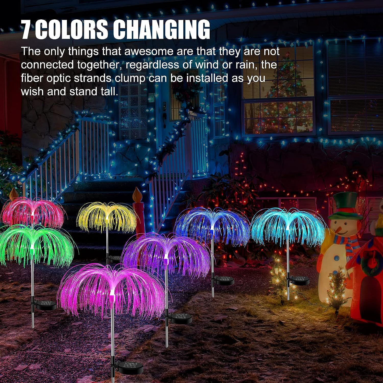 - 🌼🎁👍【7 Color Changing Solar Powered Lights 】Solar yard lights’ lamp beads feature with RGB 7 colors changing and great light transparency. These solar optical fiber lights release beauty and charm by showing their gorgeous colors, creating a strong festive atmosphere. These outdoor waterproof solar lights are the wonderful flower decorations for garden patio during the day, even a stunning light feast at night.