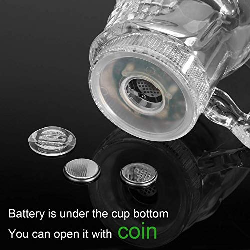 Magic cup is environmental protection transparent shine cup when pour into liquid (water, beverage, beer, etc) , it will light up and flash immediately, very magical, suitable for celebrate, party, bars, gifts and so on. Water induction cup, if no water in the cup, it will not light up. Suitable for: bar, discos, restaurants, leisure, party, friends gifts, etc. To Replace Batteries: Unscrew the battery compartment door located on the bottom of the base, place new batteries in the battery compartment and screw on the battery door.