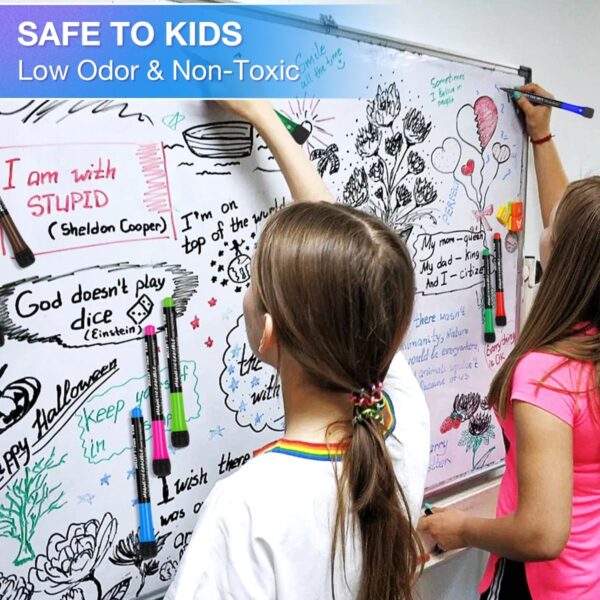 - 【Safe & Low-Odor】 Our fine point dry erase markers are water-based, non-toxic, low-odor, smear-proof and safe for kids. Designed with a strong magnet and eraser cap, the thin dry erase marker is very convenient for using at home refrigerator whiteboard. Easy to remove and clean up, won’t stain hands or dark clothes