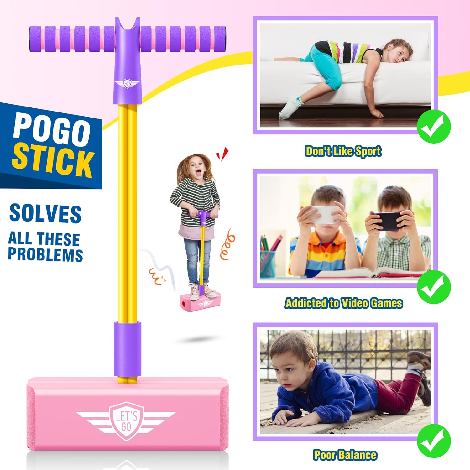 - Train balance: Pogo sticks make great active toys for kids because they help train hand eye coordination, balance, and gross motor skills; Give your kid a headstart in life with a toddler pogo stick